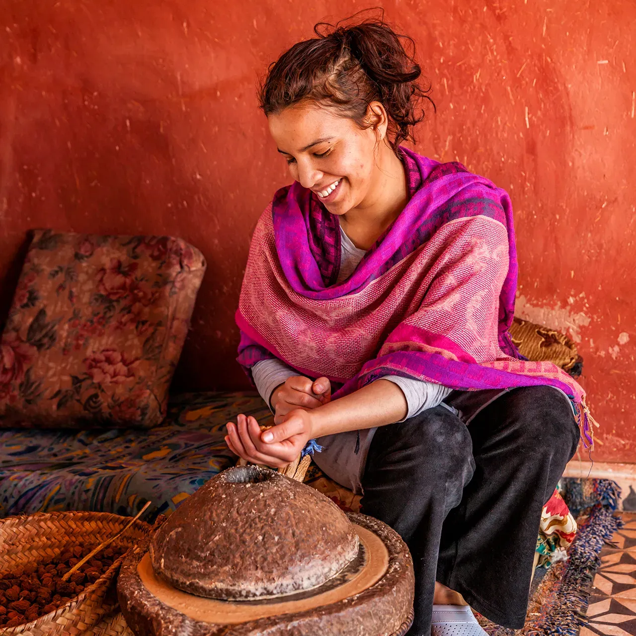 Bis dahin hat Dihya das ausschließlich für den Eigenbedarf gemacht. Wie das Trocknen der Früchte, das mühsame Aufbrechen der harten Schalen mit Hilfe eines polierten Steines und das stundenlange Vermahlen zu einer Paste, aus der schließlich das Öl gepresst wird, funktioniert, hat die 35-Jährige von ihrer Mutter und ihrer Großmutter gelernt. Das mündliche Weitergeben dieses Wissens ist seit dem 13. Jahrhundert ausschließlich Sache der indigenen Frauen.