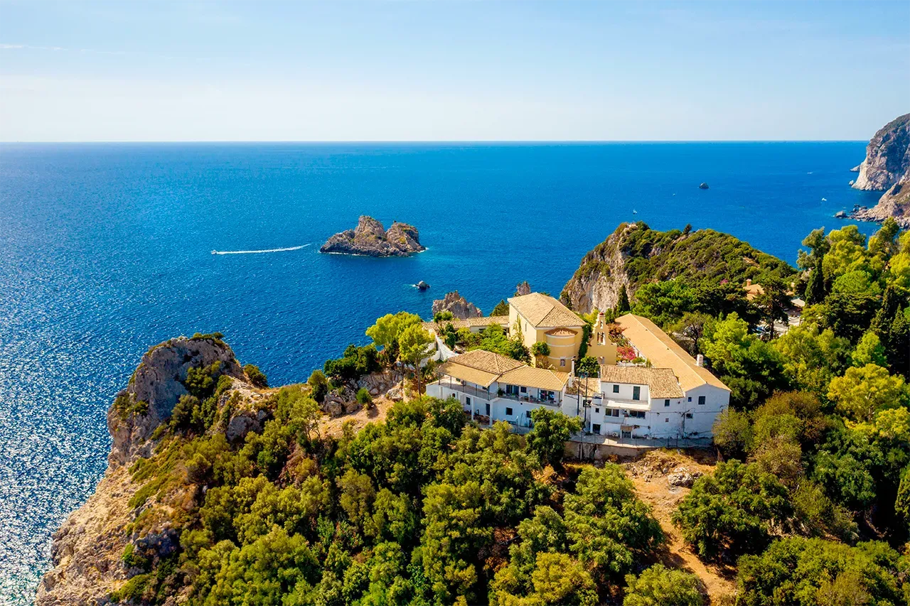 Während es auf vielen anderen griechischen Inseln trocken-karg zugeht, ist Korfu vor allem eines: grün. Das gefiel schon Kaiserin Sisi, die sich dort einen Palast (derzeit wegen Renovierung geschlossen) samt Paradiesgarten als Feriendomizil bauen ließ. Ein gutes Händchen hatten auch die Mönche, die als Standort für das Kloster Theotokou eine Steilklippe in der Bucht von Paleokastritsa wählten – Blick auf das Ionische Meer natürlich inklusive.