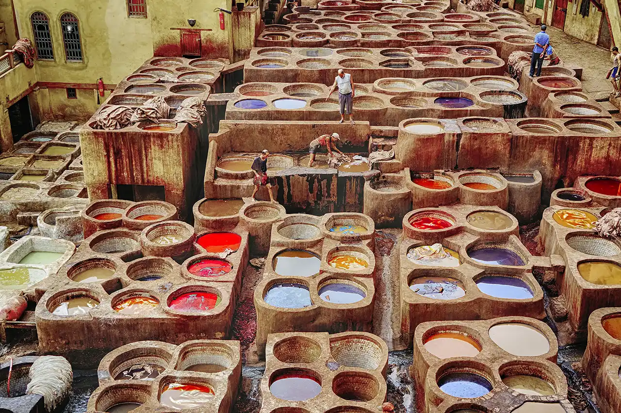 Berühmt sind die Gerbereien von Fes, in denen Leder bis heute nach traditionellen Methoden gefärbt wird. Religiöses und geistiges Zentrum der Stadt sind die al-Qarawiyyin-Moschee und die ihr angeschlossene gleichnamige Universität.