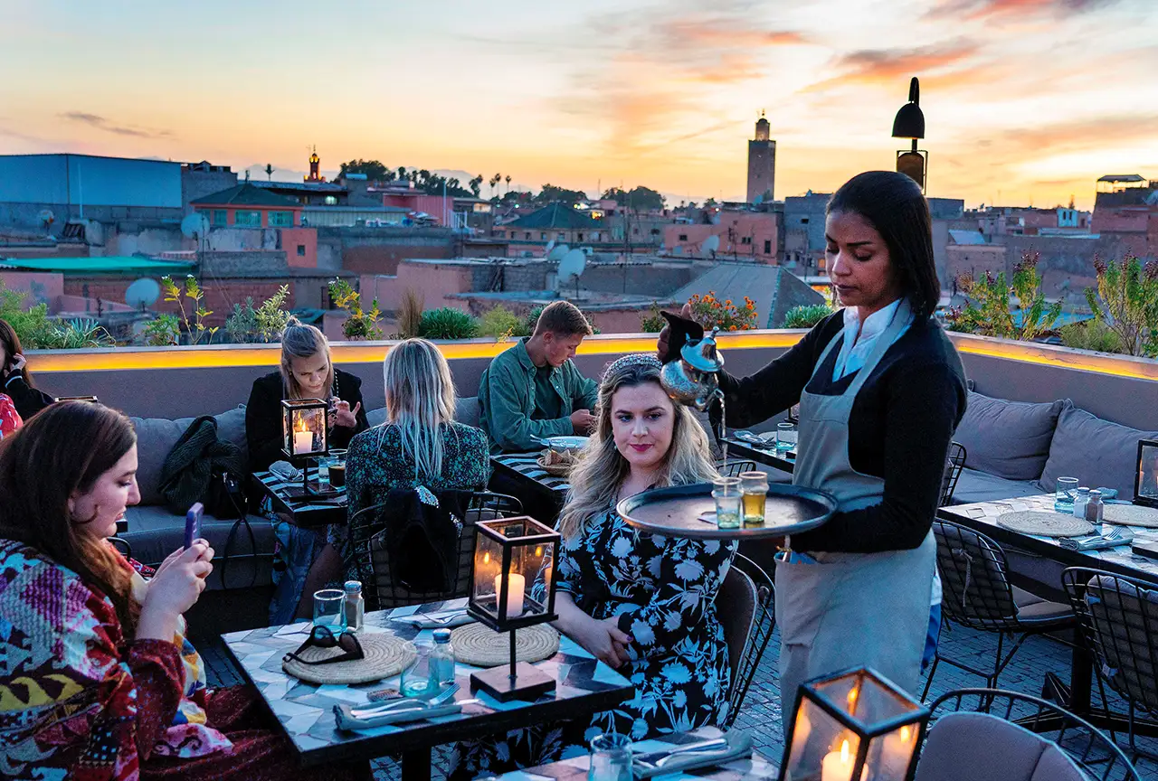 Auf der Speisekarte des minimalistisch eingerichteten „Nomad“ finden sich Klassiker wie „Tajine“ oder Couscous. Wer probieren will, wie der marokkanische Chefkoch diese traditionellen Rezepte modern interpretiert oder wie Nomad-Burger und mehlloser Orangenkuchen schmecken, sollte unbedingt einen Tisch im bei Touristen vielleicht angesagtesten Restaurant von Marrakesch reservieren. In dessen Räumen war bis 2014 noch ein Teppichgeschäft untergebracht. Besonders beliebt ist die Dachterrasse, von der aus man den Blick über die Gassen der Medina schweifen lassen kann.