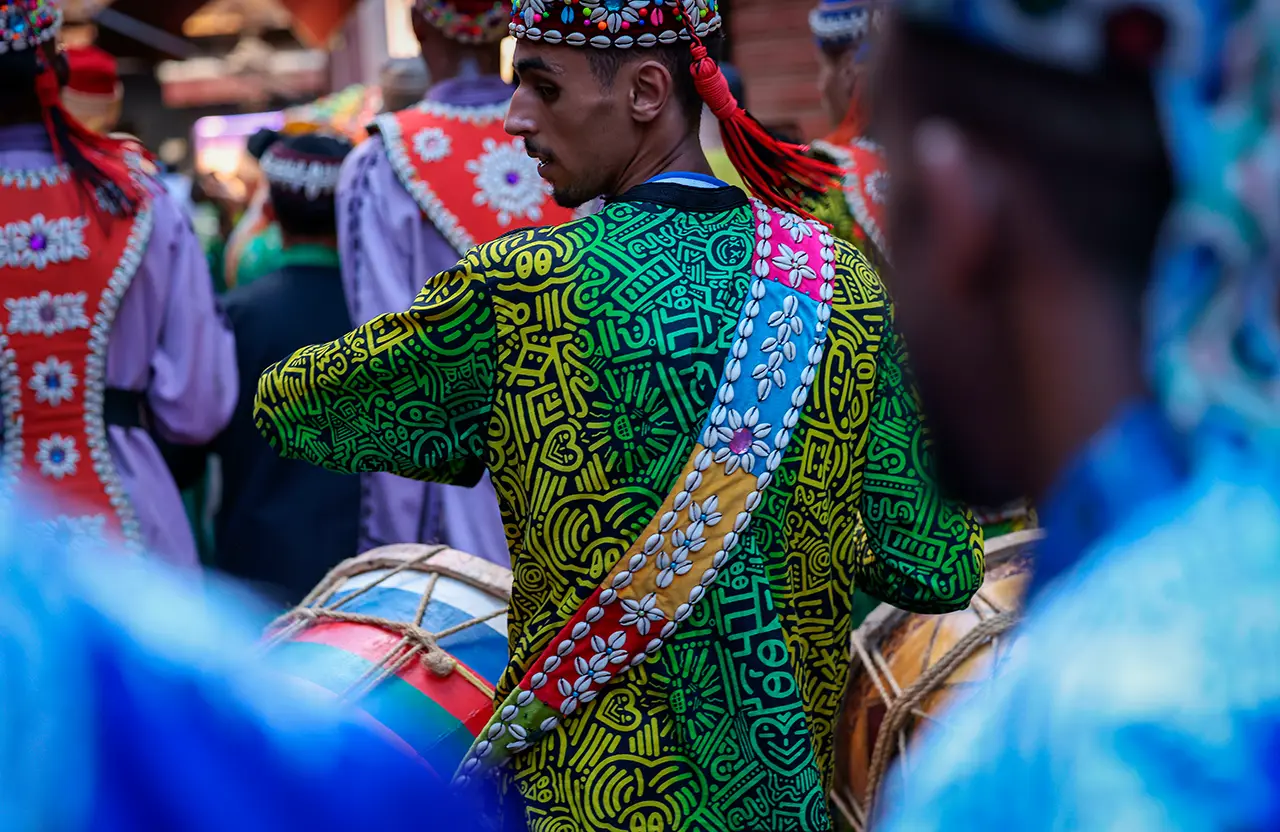 Sklaven aus Westafrika wurden im 16. und 17. Jahrhundert nach Marokko verschleppt, um auf den Zuckerrohr-Plantagen zu arbeiten oder die Armee von Sultan Moulay Imail zu verstärken. Nach ihrer Ankunft vermischen sich die rhythmischen Klänge ihrer traditionellen Musik mit islamisch-sufistischen Einflüssen zu einer einzigartigen Form der Trancemusik. Seit 2019 zählen die Gnaoua-Musik und die damit verbundenen Rituale zum immateriellen Kulturerbe der UNESCO. Den Gesang begleiten die dreisaitige Basslaute Guembri, Metallkastagnetten (Qraqeb) und Trommeln. Traditionell spielen die Musiker bei nächtlichen Zeremonien, die der spirituellen Reinigung und Heilung dienen, während sich ihre Zuhörer in Trance tanzen.