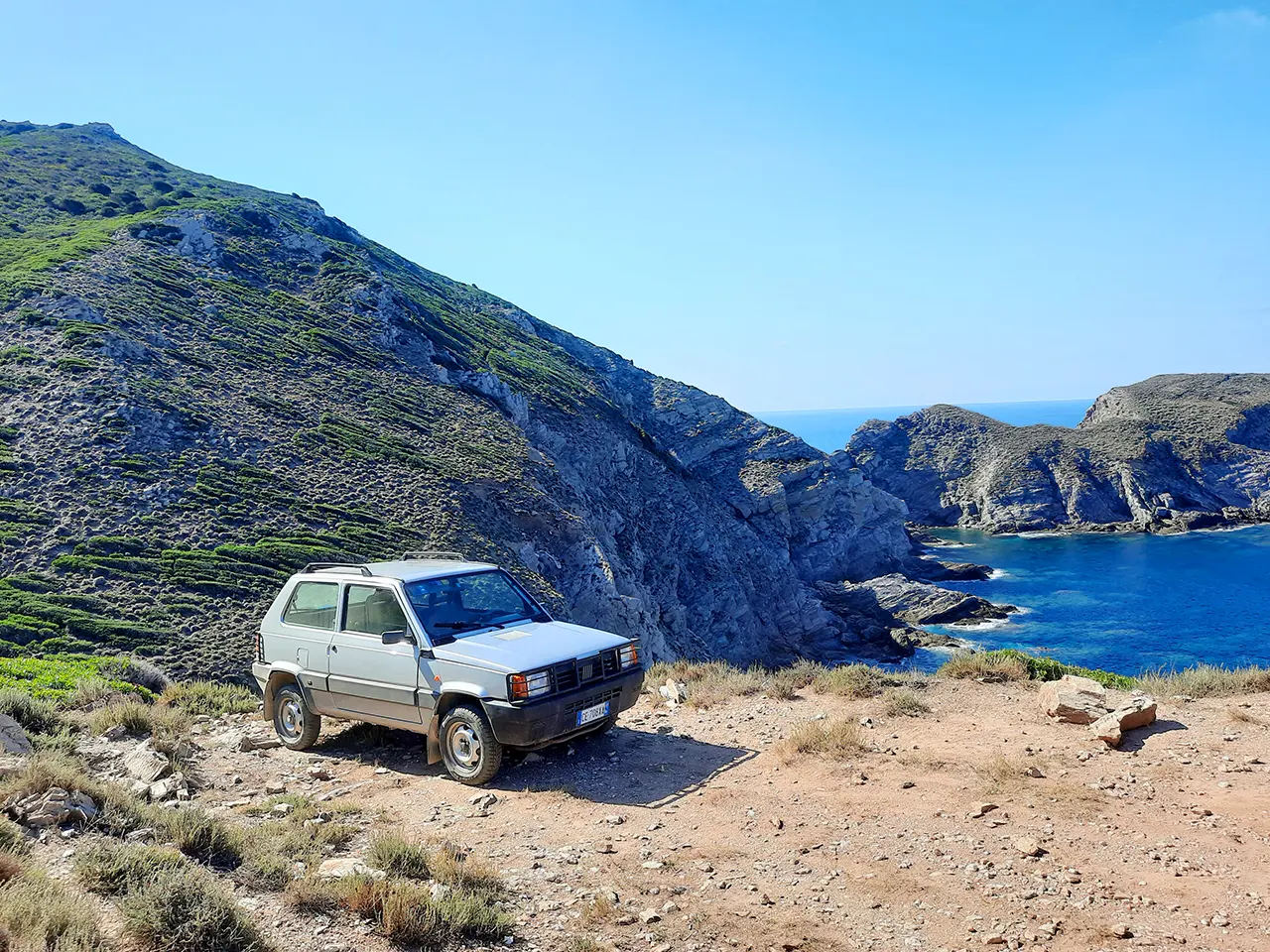 In der nächsten Bucht liegen bunte Fischerboote am Strand, und zwischen ihnen steht – wie eine Fata Morgana – ein Fiat Panda. Grau-braun wie die Felsen und rundherum nur Schotter. „Ein Panda kommt überall hin", kommentiert Lisa. Es ist ungefähr der zwanzigste – wobei nur die kastigen, mindestens 30 Jahre alten Exemplare gelten. Am Capo Spartivento hat das Panda-Zähl-Spiel begonnen, bei dem alle mit Enthusiasmus dabei sind. Anfangs ahnte noch keiner, dass man ihnen überall begegnet. Als wären sie die heimlichen Wappentiere der Insel.