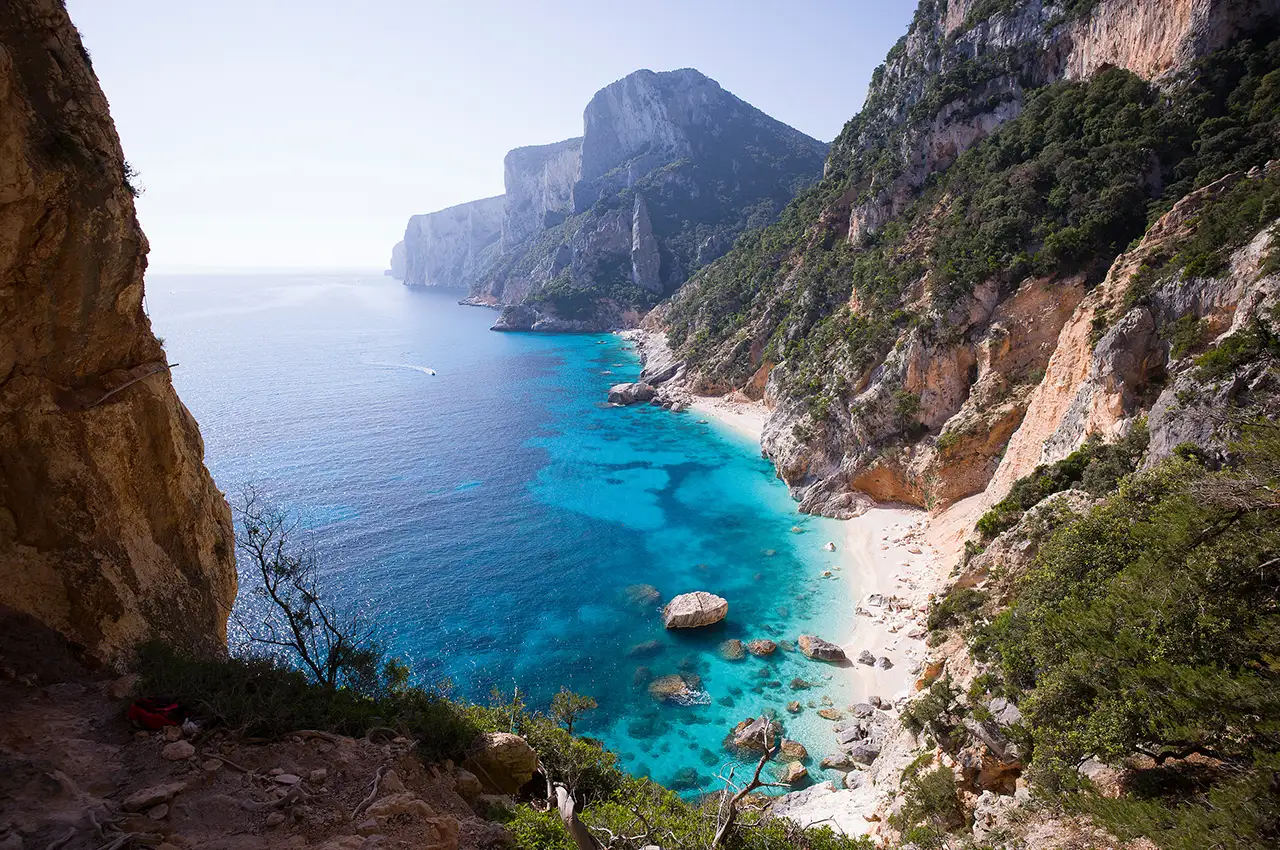 Der Bergpfad führt über die Wurzeln knorriger, alter Wacholderbäume, die sich tief in Felsspalten festkrallen, vorbei an immergrünen Mastixsträuchern, wilden Olivenbäumen und einzelnen windschiefen Steineichen. Besonders in der Mittagshitze verströmen Rosmarin und Thymian ihren betörenden Duft. Reiseleiterin Lisa Dell bleibt stehen und genießt den Ausblick. Über ihr zieht ein Adler seine Kreise, während unten das tiefblaue Wasser des Golfo di Orosei in der Sonne schimmert. Ein paar Boote ankern vor der idyllischen Sandbucht, die nur vom Wasser aus erreichbar ist. „Oder wenn man sich über die steilen Klippen von hier oben abseilt“, meint sie schmunzelnd. Die 66-Jährige ist auf dem berühmten „Selvaggio Blu“ an der Ostküste Sardiniens unterwegs, einer der wohl schönsten und spektakulärsten Trekkingrouten Europas, die historischen Hirtenwegen, Köhler- und Schmugglerpfaden folgt.