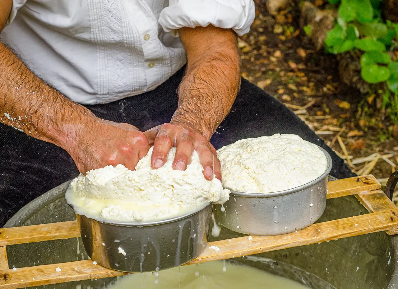 Früh morgens um 5.30 Uhr beginnt sein Tag, abends um halb acht endet er. An 365 Tagen im Jahr. Die Schafe werden von Helfern und von ihm selbst per Hand gemolken, die Milch landet anschließend kannenweise in einem großen alten Kupferkessel. Während 90 Prozent der Schäfer ihre Milch an die großen Molkereien liefern, „verarbeiten wir unsere gesamte eigene Milch und verwandeln sie in Käse.“ Er vermischt die Milch mit Zutaten, kocht und rührt sie. Mit der rechten Handfläche prüft er später die geronnene Oberfläche auf ihre Konsistenz. Erst, wenn sie einen Abdruck hinterlässt, ist der Pecorino fertig.