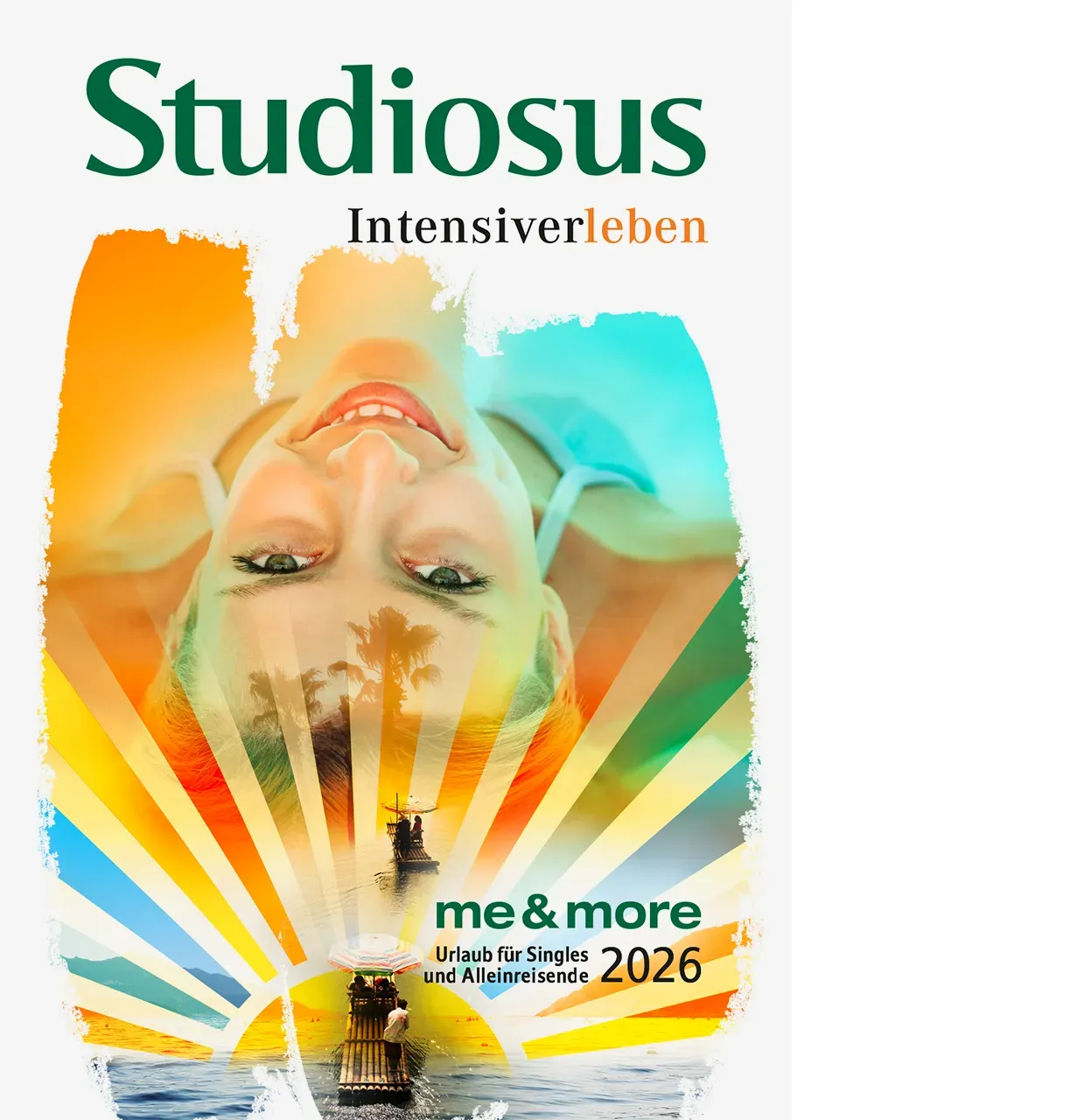 Reiseglück verdoppelt sich, wenn man es teilt: Speziell für Singles und Alleinreisende gibt es Studiosus me & more. Die Gäste dürfen sich auf ein spannendes Erlebnisprogramm, auf lustige Runden beim Abendessen oder in der Cocktailbar freuen. Und genügend Freizeit haben sie auch – um am Pool zu liegen oder mal etwas auf eigene Faust zu unternehmen. Damit sie von Anfang an den Kopf frei haben fürs Entdecken und Genießen, ist alles rundum perfekt organisiert – von den Reiserouten bis zur Reservierung komfortabler Einzelzimmer, die oft auch ein Doppelzimmer zur Alleinbenutzung sind. Durch das Besichtigungsprogramm führen erstklassige Studiosus-Reiseleiterinnen und