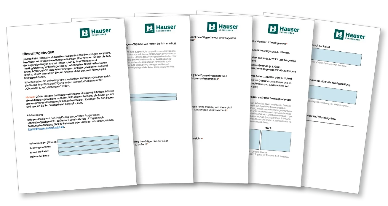 Wichtig für eure Beratung: Rund 80 % der Hauser-Reisen zählen zu den Levels 1 bis 3, sind also leicht bis mittelschwer. Genau diese Reisen sind auch gut geeignet für den Verkauf im Reisebüro. Ab dem Schwierigkeitsgrad 3 senden wir den Reisegästen, ggf. über euer Reisebüro, zusammen mit der Buchungsbestätigung einen umfangreichen Fragebogen zu ihrer Gesundheit und ihrem Fitnesslevel zu, den sie ausgefüllt an uns zurücksenden.